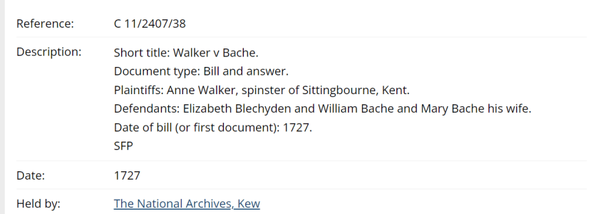- Elizabeth Bache mentioned in the will of Florence Blechynden, Mary’s sister-in-law, dated 27 April 1765.